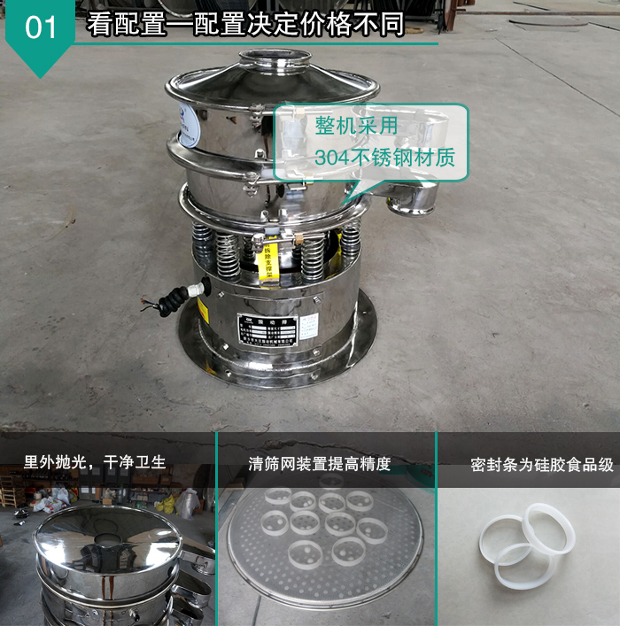 全不銹鋼振動篩整機采用304不銹鋼材質,里外拋光,干凈衛(wèi)生,無毛刺,無死角,密封條為硅膠食品,彈簧外圍加304不銹鋼裙邊,同時還配備有專門的篩網清理裝置,可將堵網率降到低,過網率和處理精度得以有效提高。 看型號—型號決定價格不同