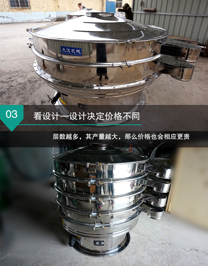 新鄉(xiāng)大漢全不銹篩振動篩生產的直線振動篩型號從DH600到DH2000,不同型號的全不銹鋼振動篩,其直徑、篩網面積是不同的,所以這就決定了不同型號的全不銹鋼振動篩產量是不同的,這也必然會造成全不銹鋼振動篩價格上存在明顯的差異。 看設計—設計決定價格不同